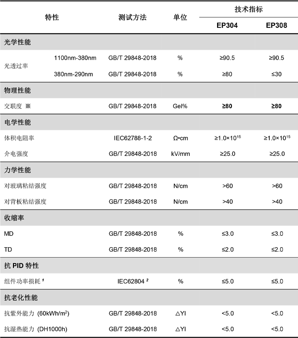 F·RST EP304 & EP308產品是一款共擠型封裝膠膜產品,由EVA和POE采用物理共擠壓合而成,具有長效的雙面電池抗PID性能,可幫助P型或N型雙面電池常規和雙玻組件通過85oC,RH 85%,-1500Vdc,192h的PID測試。同時,EP系列膠膜兼具優異的粘結性能、透光性能和長期耐候性能。